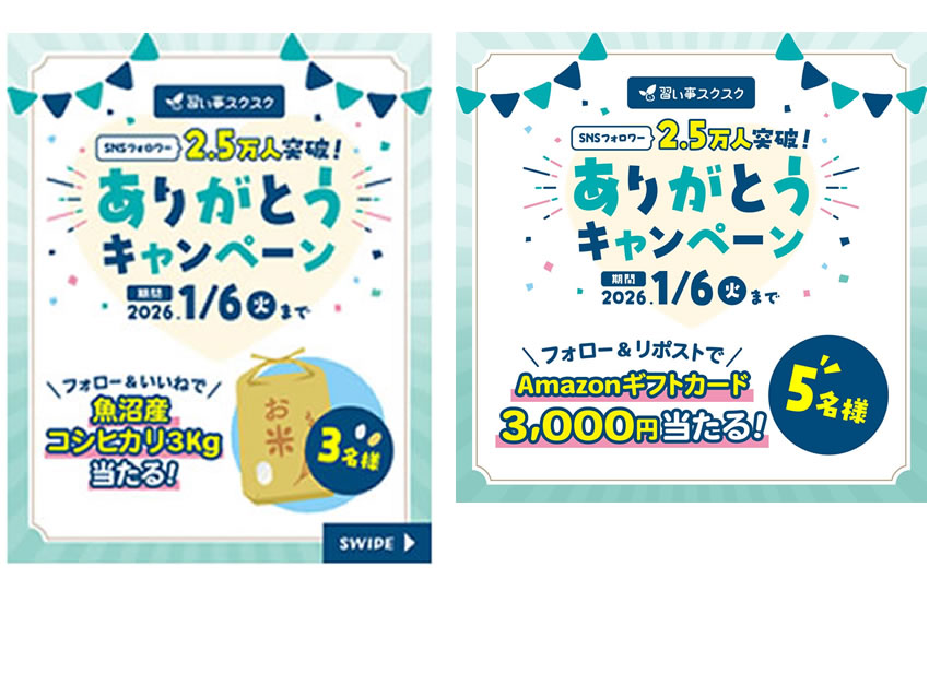 株式会社Fanss(本社:神奈川県横浜市、代表取締役:杉山裕治)が運営する子どもの習い事メディア「習い事スクスク」は、公式SNS(Instagram・X)の総フォロワー数が2.5万人を突破しました。これを記念し、2025年12月2日(火)よりSNS利用者を対象に「SNSフォロワー2.5万人突破!ありがとうキャンペーン」を実施します。